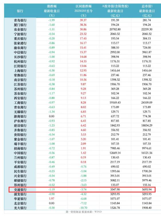 图表显现,交通银行蛇年股价跌幅3.74%,居国有行跌幅第一,快乐飞艇app居A股42只银行股跌幅第五。